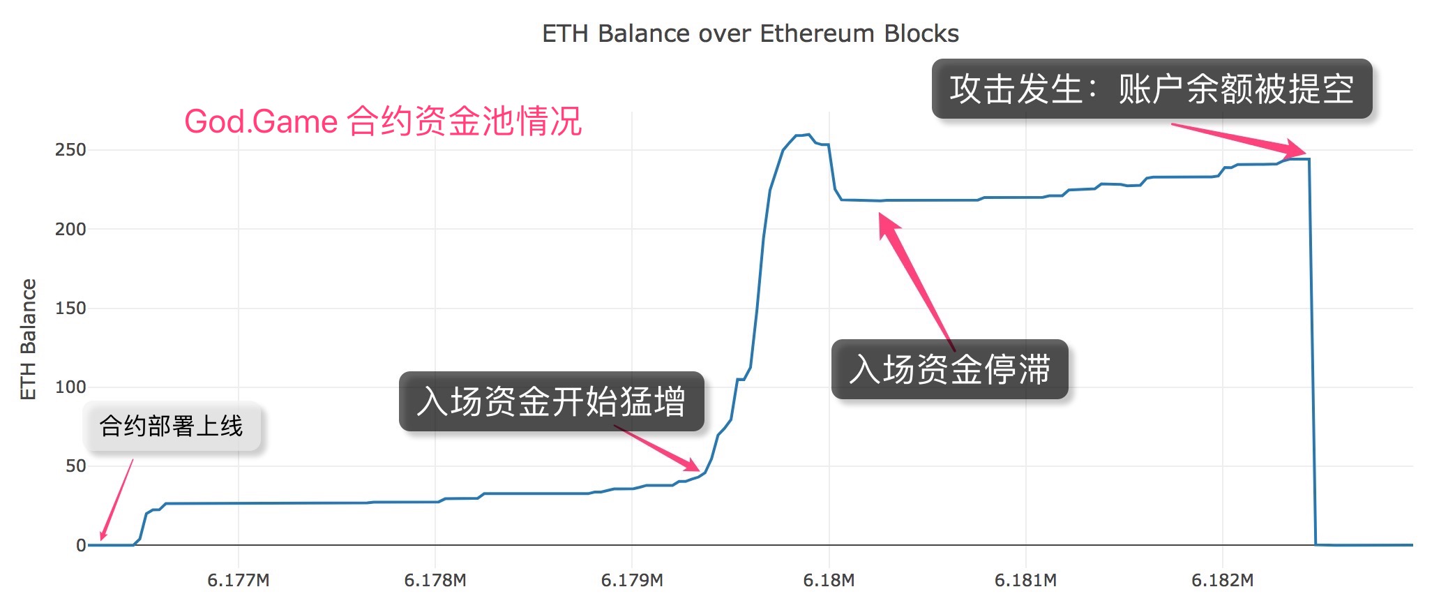 谜底揭开:漂亮的组合拳我们不妨看看在God.Game合约中发生了什么? 攻击者第1步:从自己账户转移token到合约,触发transferFromInternal函数中的第一个else if分支: 攻击者将自身的payoutsTo_[_customerAddress]被减为负数,紧接着修改`tokenBalanceLedger_[from/to]进行普通的token转账操作,给代理合约一些token以便拥有dividens。 攻击者第2步:代理调用withdraw(),payoutsTo_[_customerAddress]值增加。 攻击者第3步:将代理合约的token转移到攻击者账户,触发transferFromInternal中的if分支: 攻击者的payoutsTo_[_customerAddress]值增加,同时将代理合约中的token全部转移到攻击账户中。 可以看到,这3步组合让代理合约满足了减法溢出所需条件: